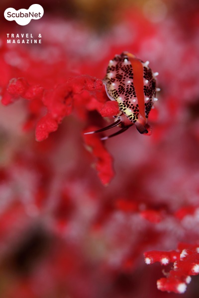 부채뿔산호 위의 주홍토끼고둥니콘 D800, 105mm, f8, 1/250, ISO100, WB Auto.