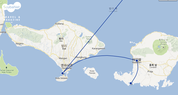 롬복 이동지도마타람 공항에서 베롱가스 베이(Belogas Bay)로다이빙숍에 픽업을 요청해야 한다. 차로 약 2시간 이동 후, 배를 이용해 만을 건너게 된다. 배로는 약 10분이 소요된다.