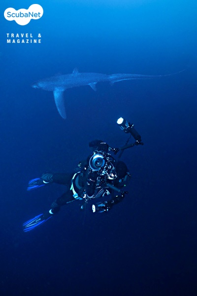 보트의 발전기에 이상이 생겨 타와리 리조트에 배를 정박시키고 딩기를 이용하여 다음날 다이빙을 진행하였다. 콤프레셔를 돌릴 수 없어 공기통의 충전을 할 수 없을 뿐 아니라 샤워도 할 수 없는 상황이었다. 리조트 앞으로 조금만 나가면 작은 사각부표 구조물이 떠있다. 맑은 시야가 아쉬웠던 우리는 선장에게 블루워터 다이빙을 제안하였고, 롭은 사각부표에 앵커라인이 있으니 그 곳에서 다이빙을 해보라고 하였다. 이른 아침, 시커먼 심연 속으로 앵커라인을 따라 내려갔지만 기대만큼 시야가 터지지 않았다. 30여m 수심에서 대물을 기다리다 별다른 소득 없이 조금 상승하여 단체사진을 촬영하는데 다이버들의 손이 우리의 뒤를 가리킨다. 돌아보니 커다란 환도상어가 유유히 지나가고 있었다. 급한 마음에 셔터를 눌렀지만 노출은 상향앵글에 맞춰져 있는 상태라 시커먼 물 속에 흐릿한 실루엣만 잡혔다. 물만 보고 나가는가 했는데 이런 횡재를 만나다니...