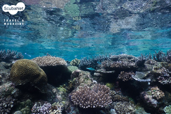 절벽을 따라 진행하면 중간에 산호가 발달된 완만한 곳과 크랙이 멋지게 갈라진 곳이 나오며, 이를 지나면 수심 50cm에 발달된 산호정원이 펼쳐진다. 강한 햇살이 부서지는 산호정원은 잔잔한 수면과 어우러져 싱그러운 느낌을 주며, 이 수심에 어떻게 이런 산호정원이 형성되고 유지가 될 수 있는지 경이롭기만 하다. 이곳을 지나 조류가 강한 코너를 돌면 모선이 정박해 있는 Decon’s Reef에 다다른다. 핀킥을 열심히 하면, 한 번의 다이빙에 모선까지 돌아오기도 한다. 조깅 삼아서...