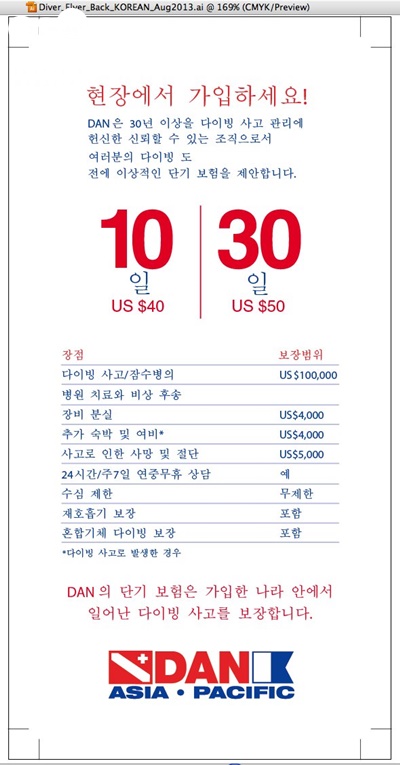 다이빙사고로인한응급후송이나치료비는해외에서는매우비쌉니다. DAN의멤버가되어서이에대비하시기바랍니다.