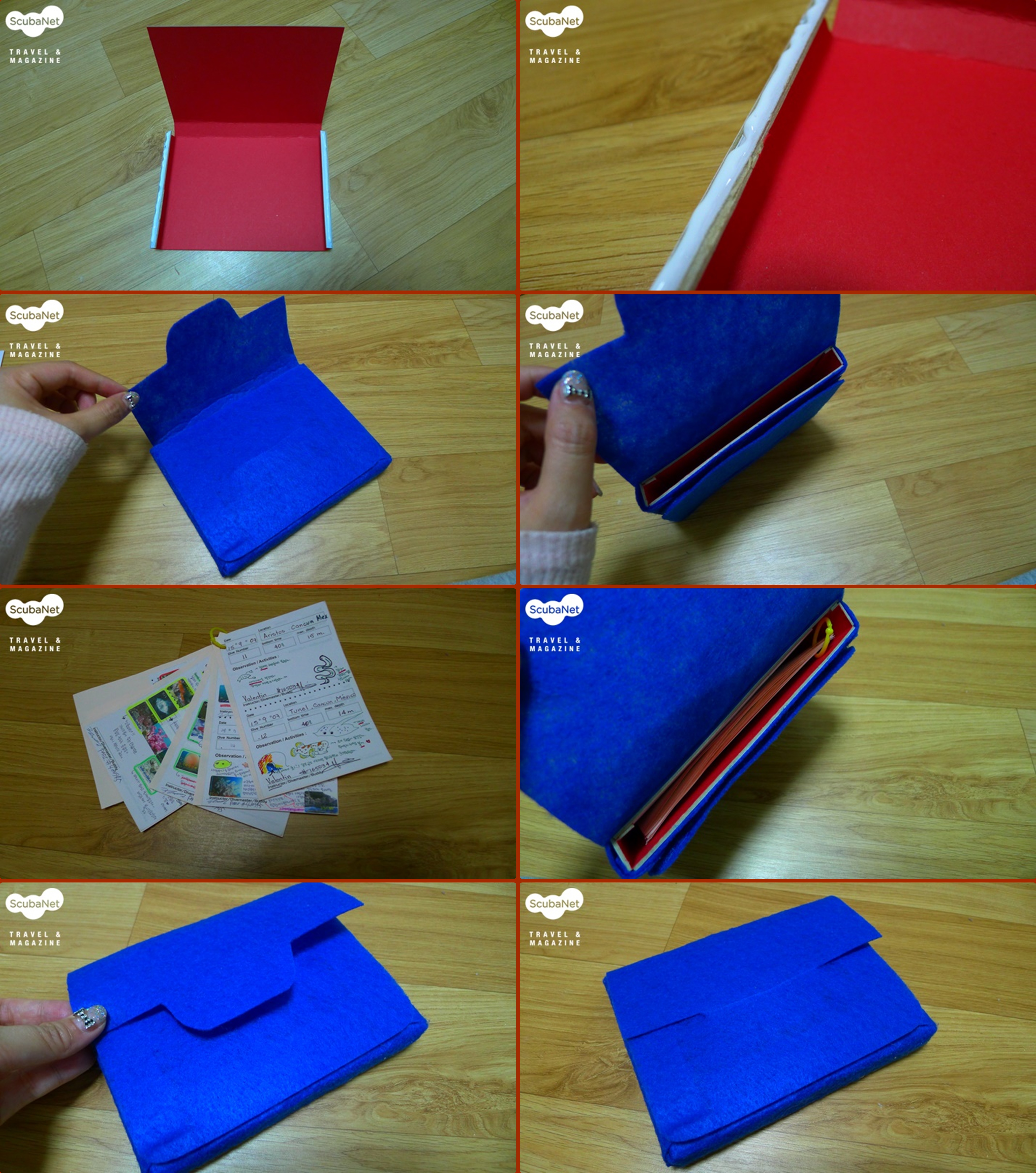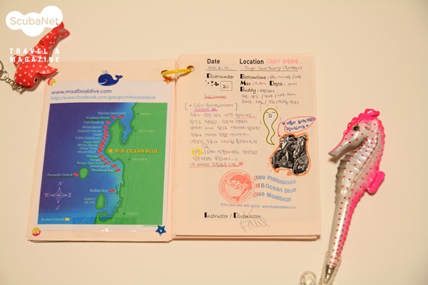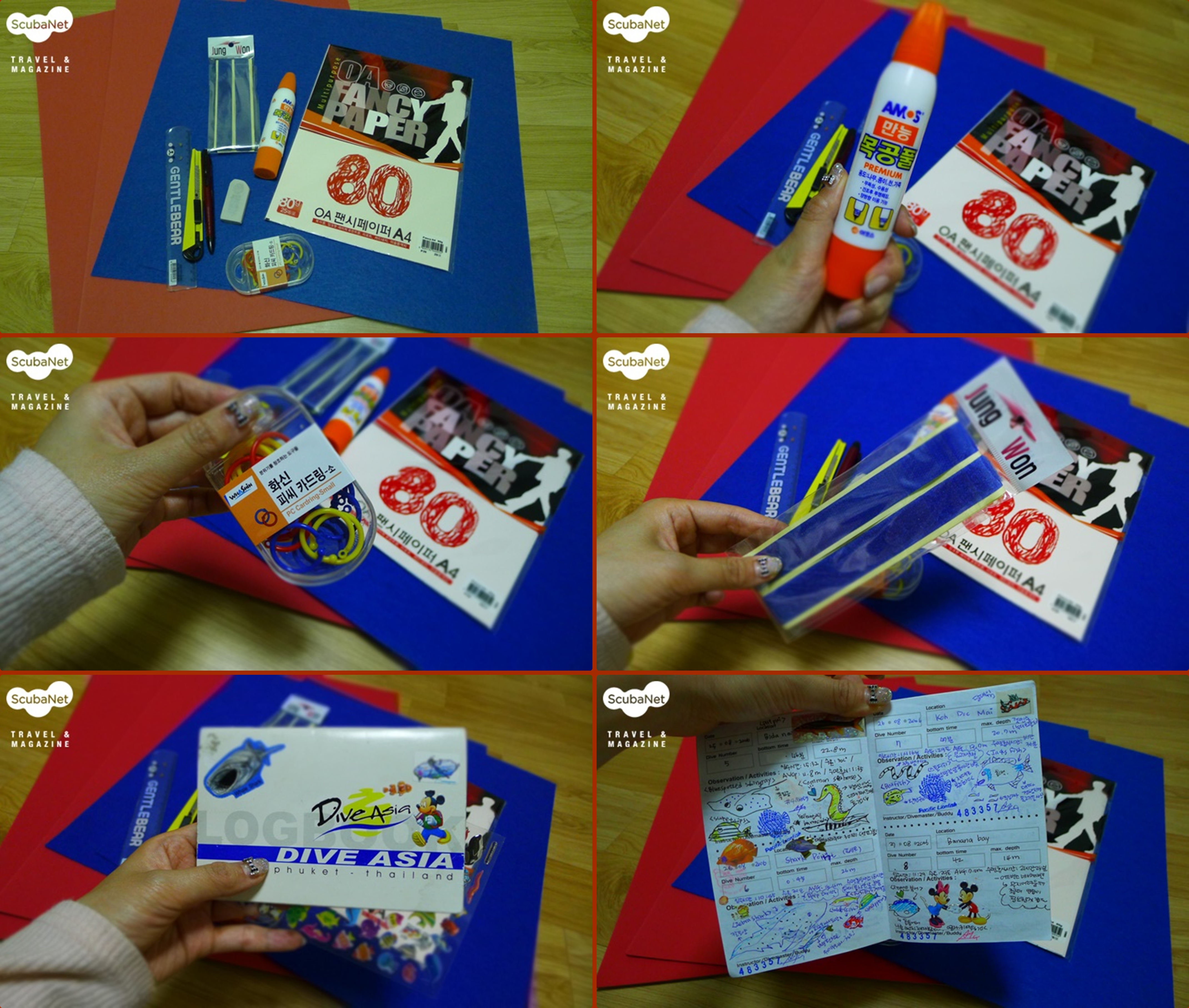 로그북을 만드는 방법이 꼭 정해진 것은 아니잖아요? 지극히 개인적인 기록이기 때문에 작성하는 사람의 기호에만 맞는다면 상관 없다고 생각해서 일단, 빈칸이 최대한 많아야 했어요. 내 마음대로 글을 적고 싶으면 글을 적고, 그림을 그리고 싶으면 그림을 그리고, 사진을 붙이고 싶으면 사진도 붙이고, 또 그림을 그리다가 망치면 깨끗하게 찢어 버리고 새로 다시 쓸 수 있어야 했으니까요. 만들기 실력이 썩 좋지 못해서 어떻게 만들어야 할까 고민 고민하다 탄생한 로그북이 지금의 로그북이에요. 마치 초등학교 만들기 시간에 장난 삼아 만든 것 같이 로그북을 만들어서 다이빙을 다니다 보니, 제 로그북을 보시는 많은 분들은 다들 한마디씩 하신답니다.