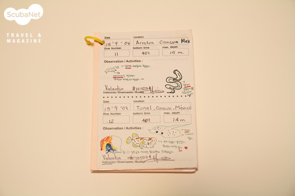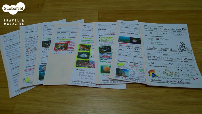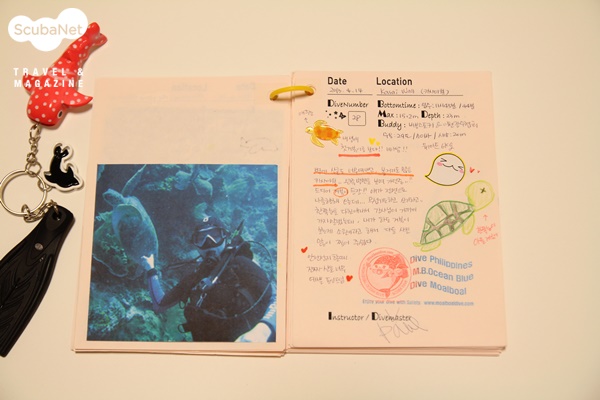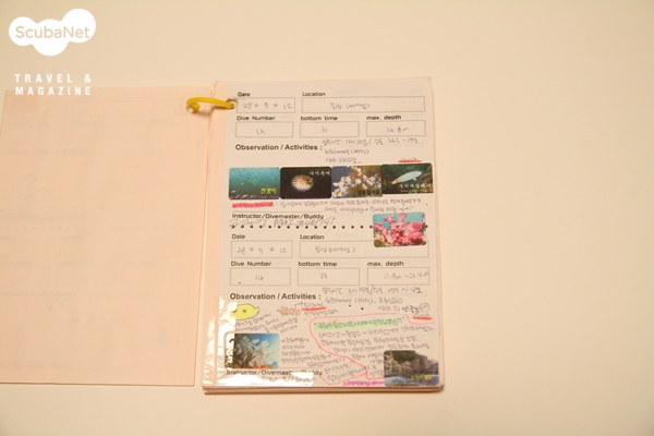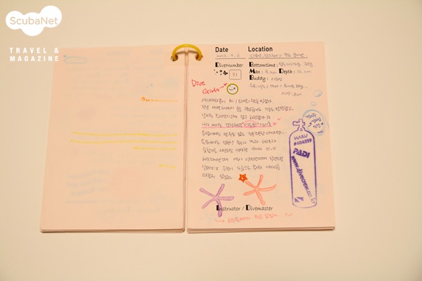 첫 교육을 해주신 강사님이 제가 로그북을 열심히 쓰게 된 계기가 되었어요. 교육생들에게만 로그북을 열심히 작성하라고 한 것이 아니라 교육을 해주신 강사님도 100회 넘도록 매일매일 로그북에 그림도 그리고 스티커도 붙여가며 교육생들과 함께 열심히 작성하고 계시는 모습을 보고, 아~ 나도 다이빙을 계속 하게 되면 강사님처럼 100회고 200회고 꿋꿋하게 그림도 그리고 스티커도 붙이고 아기자기하게 예쁘게 꾸며가며 로그북을 작성해야지!! 라고 생각하며 교육을 받으며 강사님 따라서 로그북을 정성껏 기록하였어요.