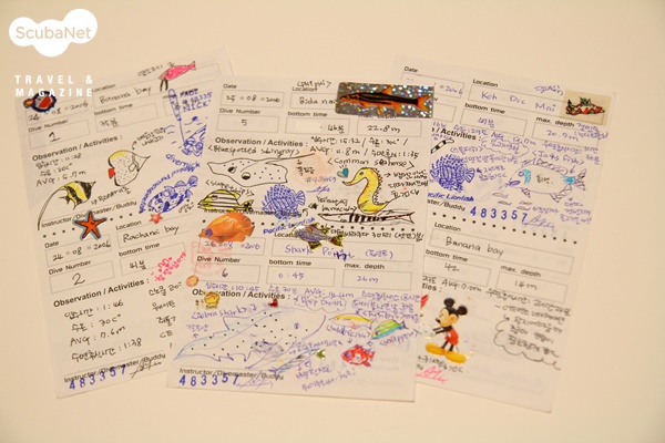 8년 전 푸켓에서 교육을 받던 당시에 다른 강사님들과 다르게 저를 교육해주신 강사님께서 로그북은 무조건 화려해야 한다며, 제 손에 사인펜과 색연필과 어류도감을 쥐어주시며 그림을 그리게 하셨어요. 다이빙을 한번 하고 올라오면 방금 봤던 물고기들을 나열해주시며 그림도 그리게 하고, 물고기 이름도 알려주시며 교육생들의 로그북이 절대 휑~ 하지 않게 스티커도 붙여주시고 귀여운 가시복어 도장도 찍어주셨답니다.