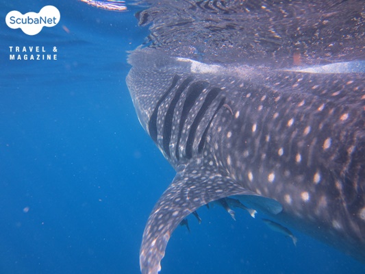 플랑크톤을 먹기위해 입을 벌린 고래상어배를 타고 1시간 가량 나가자 너무나도 쉽게 고래상어 무리를 만날 수 있었다. 고래상어 투어를 진행하는 배들이 무척 많았는데 이들이 함께 그물 대형으로 거리를 두고 고래상어의 서식지 방향으로 가다가 한 배가 발견하면 무전으로 알려서 배들이 집결하는 시스템이었다. 입을 크게 벌리고 플랑크톤을 흡입하며 돌아다니는 고래상어 무리를 보고 바로 뛰어들고 싶었으나 안전상의 문제와 고래상어 보호 차원에서 2명씩 조를 짜서 가이드와 함께 고래상어를 보러 물속에 들어갔다. 사실 고래상어의 거대한 입에 빨려 들어가면 어쩌나 하는 걱정을 했었는데 고래상어가 알아서 요리조리 잘 피해 다녔다. 고래상어는 진행 방향에 사람이 있으면 물끄러미 바라보다가 진로를 획 틀어버렸다. 덩치에 비해 정말로 작은 그 눈을 마주친 순간 ‘밥 먹는데 귀찮게…’라고 쳐다보는 듯한 느낌을 받아 좀 미안했다. 3차례 고래상어와 수영을 마치고 아쉽지만 작별을 고하고 육지로 돌아왔다.