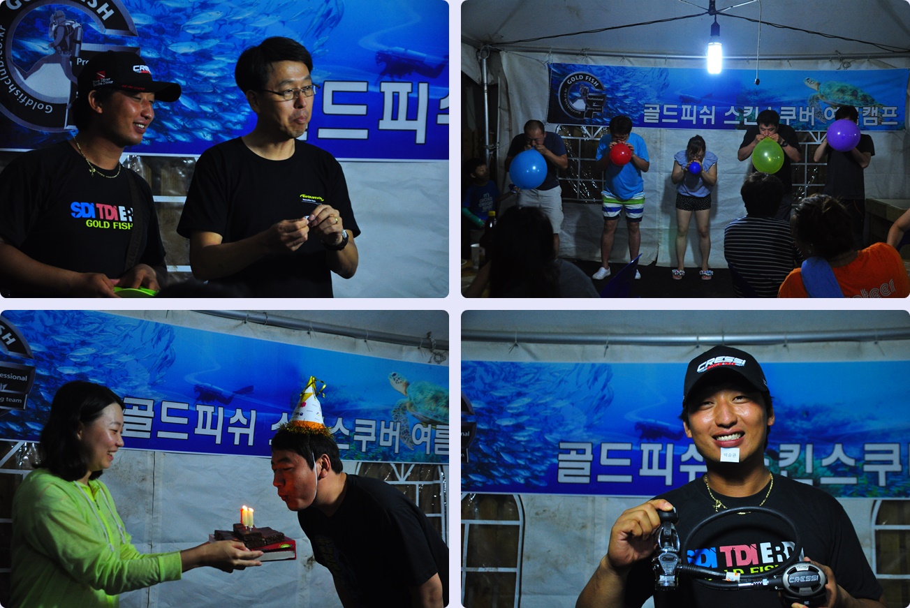 맛있는 저녁 식사와 재미난 게임!즐거운 다이빙이 끝난 저녁 시간에는 리조트 뒤뜰에 모여 바비큐 파티를 벌였다. 맛난 고기와 해산물을 먹으며 나누는 즐거운 다이빙 이야기에 리조트에는 웃음꽃이 가득했다. 저녁 식사가 끝난 후에는 게임을 통해 푸짐한 선물이 받을 수 있었다. 조별로 진행된 게임은 간단한 풍선 터트리기에서 빨대로 양파링 전달하기, 스피드 퀴즈 등 고전적이지만 하는 사람과 보는 사람 모두가 즐거운 것들이었다. 게임에서 이기고 선물을 받은 사람들도 즐겁지만 함께 게임을 하며 웃고 떠드는 것만으로도 즐거운 시간이었다.