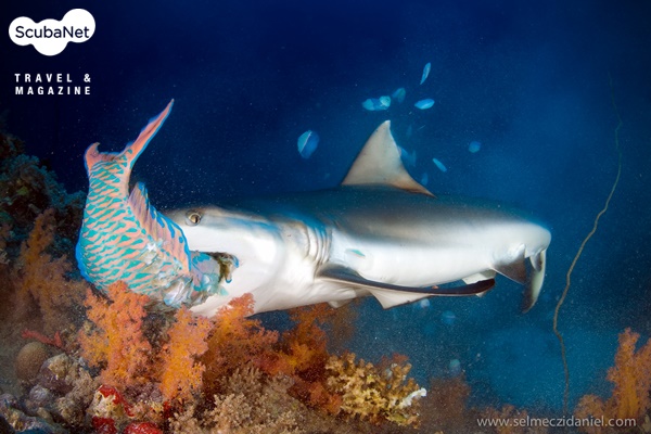 고무보트로 20분 정도 이동해 북쪽 고원에서 하강하여 아래를 내려다 봤을 때 거대한 그레이 상어의 실루엣이 아래로 지나가는 것을 발견했다. 이 지역에서 상어를 보는 것은 거의 100% 보장되는데 쿠스또의 상어 피딩 캐이지가 산호에 덮힌채 남아 있기도 하다. 상어들은 오랫동안 습관적으로 이 곳을 방문해왔는데 피딩이 다시 재개되기를 바라는 것 같았다.
