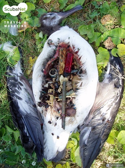 미국 미드웨이 환초에서 발견된 알바스트로스 새끼의 사체