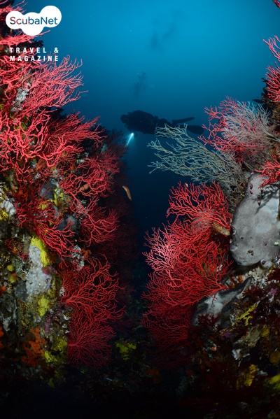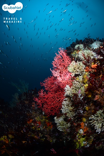 낙산대기 포인트의 봉우리를 장식하고 있는 부채활산호군락과 그 위를 지나가는 볼불락 무리들