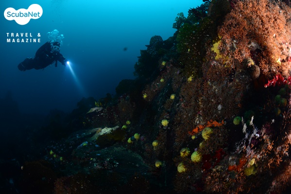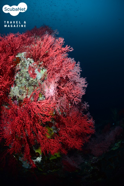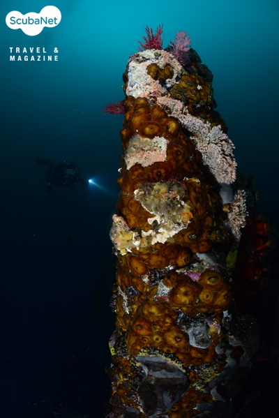 리조트를 찾은 대부분의 다이버들이 다이빙을 끝낸뒤에 수업을 마친 수원여대 교수진들과 함께 다이빙을 나갔는데 이미 늦은 오후라 해가 곧 떨어질 듯싶었다. 입수하니 시야는 좋았지만 빛이 많이 부족하여 ISO를 1600까지 올린 다음에야 겨우 물색을 찾을 수 있었다. 수심 25m 내외를 따라 봉우리들이 줄지어 있었는데 봉우리들 전체가 붉은 부채뿔산호로 뒤덮여 있었고, 히드라산호붙이, 섬유세닐말미잘, 해면 등이 붙어서 수중은 울긋불긋한 가을 색을 띠고 있었다. 게다가 하늘을 뒤덮은 불볼락 무리들까지 더해 해외바다가 부럽지 않을 정도로 아름다웠다.