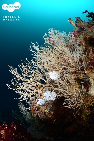 마이산 포인트의 칼바위 계곡.섬유세닐 말미잘 군락과 부채뿔산호 군락이 대조적이다