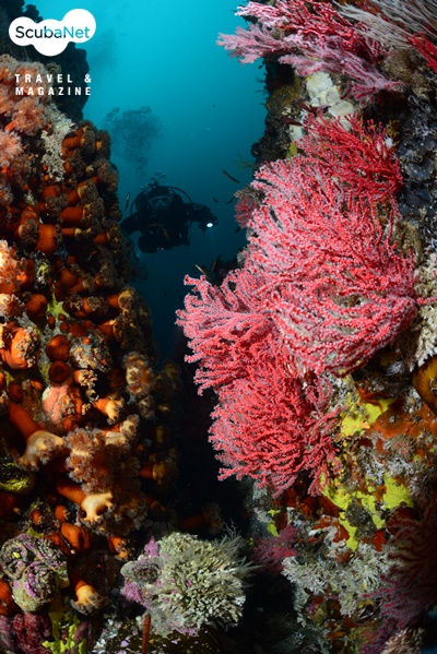 다시 마이산 마이산 포인트의 가장 높은 봉우리를 향해 돌아오는데 계곡 사이로 부채뿔산호와 히드라산호붙이가 무성했고, 산란기를 맞아 노란색으로 물든 쥐노래미 수컷이 높은 곳을 차지하고 암컷들을 기다리고 있었다. 멋진 계곡에서 모델을 배경으로 사진을 촬영할 수 있었다.