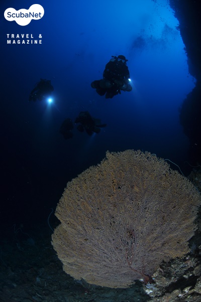 부채산호와 하강중인 다이버들