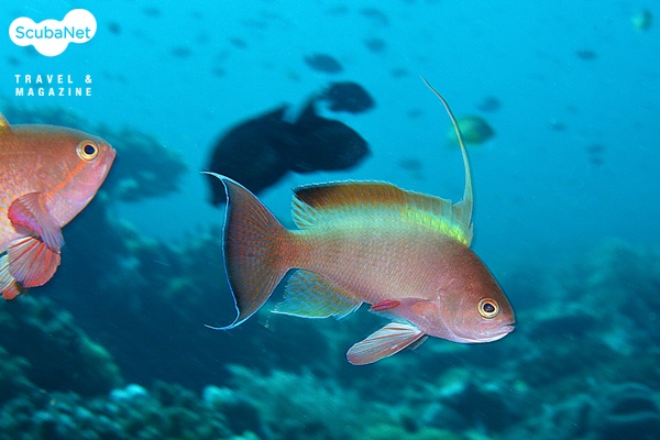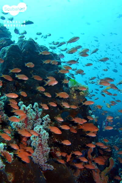 2 경사호에 몰려있는 작은 물고기를 앞에 놓고 다이버를 촬영하였다. 경산호와 물고기의 색을 살리기 위하여