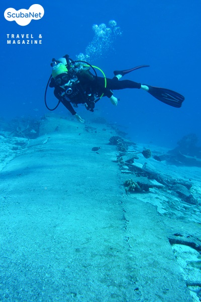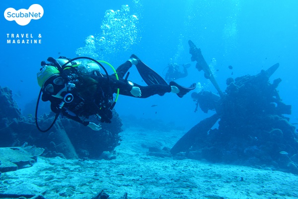 B29 폭격기의 날개 잔해위를 유영하는 다이버를 내장 스트로브를 사용하여 촬영하였으