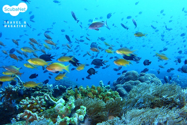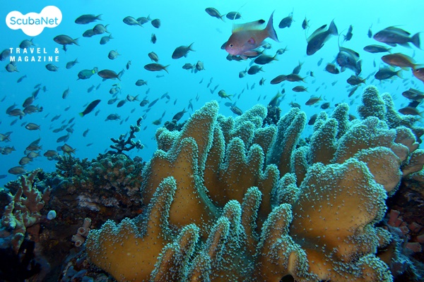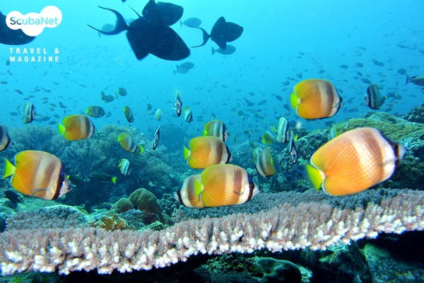 1 테이블산호 주위에 모여있는 나비고기의 화려한 색을 살리기 위하여 노출은 배경 물색