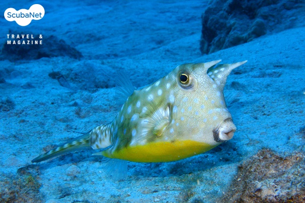 10m 정도의 수심의모래지역에서 Cowfish를 줌을 당기고 내장 스트로브를 발광하여 촬영한 사진. Landing