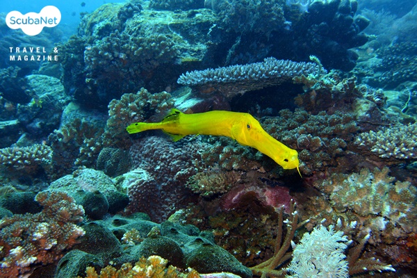 산호 주변을 맴도는 노란색 트럼펫피시에 서서히 접근하면서 내장 스
