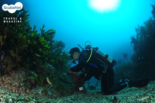 독도의 감태와 대황해중림에서 해양 조사를 수행하고 있는 필자