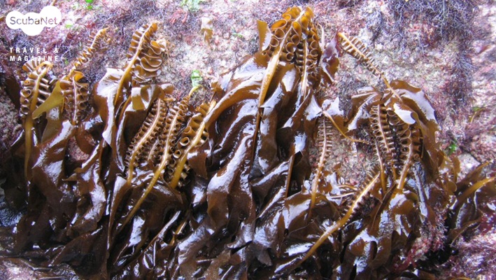 조간대에 서식하는 미역(맹골도) – 주름진 부분은 “미역귀”라 불리며,포자를 방출하는 곳이다.