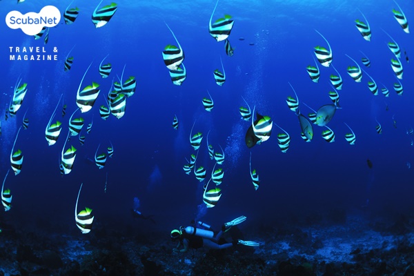 배너피쉬 무리와 지나가는 다이버물고기들은 자기에게 익숙한 동선을 그리며 움직인다. 다이버가 다가가면 물러났다가도 다이버가 멈추면 다시 돌아온다. 물고기를 쫓아가기 보다는 물고기가 다이버들에게 익숙해질 수 있도록 천천히 다가가야 한다. 그리고 속으로 물고기들에게 ‘사랑한다, 사랑한다’라고 마음을 전달하면 물고기들도 좋은 기회를 준다.