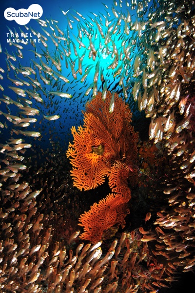 부채산호와 카디널피쉬수많은 카디널피쉬 무리에 가려져있는 부채산호를 발견하고 촬영한 사진이다. 일반적으로 라이팅을 하면 카디널피쉬가 적정이 되면 부채산호가 어두워지고, 부채산호가 적정이 되면 카디널피쉬는 날라버린다. 또 가까이 접근하면 카디널피쉬가 옆으로 퍼지면서 부채산호가 드러나지만 약간만 뒤로 물러나면 카디널피쉬가 부채산호를 가려버리는 상황이었다. 결국 스트로보 한 개를 풀어서 따로 라이팅을 하면서 부채산호와 카디널피쉬 모두가 적정이 되도록 라이팅을 할 수 있었고, 몰려드는 카디널피쉬를 적당히 뒤로 물러나게 만들어 부채산호가 드러나도록 하였다. 이 사진을 완성한 후에야 비로소 이제는 사진을 좀 만들 수 있겠다는 자신이 생겼다고 한다.