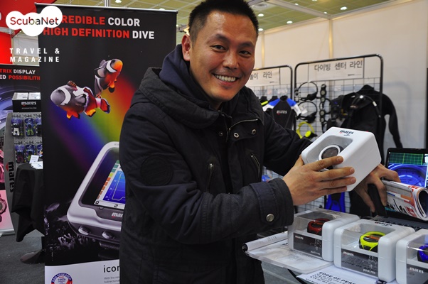 퐁당닷컴의 이영우 대표가 마레스 부스에서 퍽프로 다이브컴퓨터를 반기는 모습