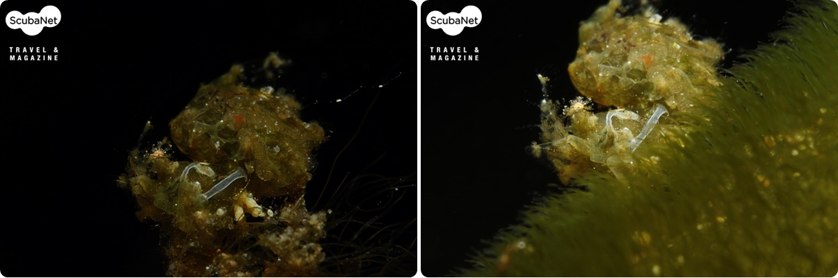 최근 여러 지역에서 발견되고 슈퍼마크로 촬영의 대상이 되고 있는 Hairy shrimp. 케논 MP 65mm 450 % 확대 촬영하였다. 첫 번째 사진에 비해 두 번째 사진에서는 피사체 생물과 대비되는 같은 색의 해조류 위에 자연스럽게 서식하는 모습을 볼 수 있다. 주 피사체의 조연 역할을 할 수 구조물로 인해 우리의 눈을 더 편안하게 해 줄 수 있을 것이다. 이런 점에서 앞 사진보다는 뒷쪽 사진이 좀 더 예술적이고 좋은 사진이라는 생각이 든다.