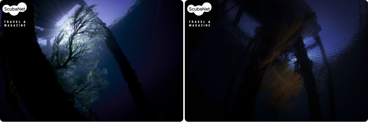 필자가 같은 곳을 몇 번씩 들어가서 해의 방향과 그것에 맞는 시간을 계산하여 다시 들어가서 촬영한 사진이다. 좋은 사진을 찍는 방법 중 촬영시간도 중요한 변수이지만 제한된 다이빙 시간과 여건상 쉬운 일은 아닐 것이다.