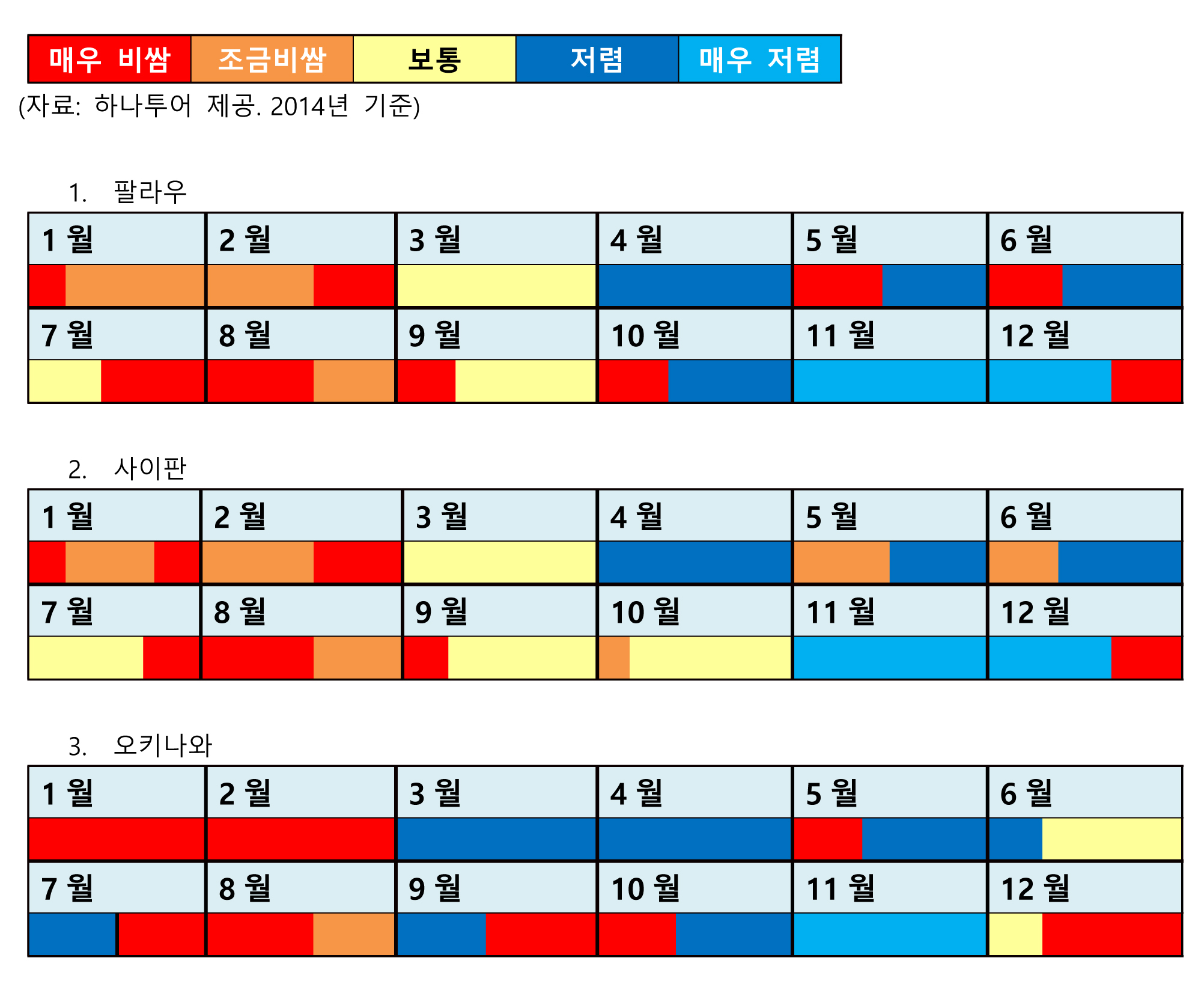 많은 사람들이 잘 알고 있듯이 해외투어는 항공료, 현지 성수기 시즌에 따른 호텔 등의 비용이 달라지는데, 그 중에서도 항공료가 투어 비용에 가장 큰 영향을 끼친다. 항공료는 날짜에 따라 몇 배 이상의 차이가 나기도 하는데, 다이버들의 이해를 조금이나마 돕고자 몇몇 다이빙 지역의 2014년 항공요금 추이를 소개해보려고 한다.