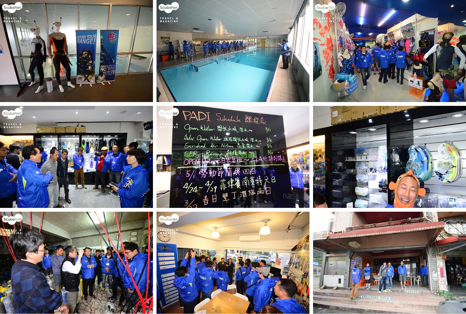 타이완의 스쿠버 다이빙 산업체 방문이번 투어에서는 타이완의 다이빙풀과 수영장, 스쿠버숍과 수영용품숍, 바닷가의 다이빙숍 등을 방문하며 타이완의 다이빙 산업을 견학하고 이해하는 시간을 가졌다. 타이완의 1세대 다이버가 운영하는 15년 역사의 다이빙풀 태평양잠수(太平洋潛水)는 아직도 연간 600명의 다이버를 배출하고 있다고 했으며, 3년 전에 문을 연 난강스포츠센터(南港體育中心)의 다이빙풀은 타이페이의 많은 강사들이 활발하게 이용하여 강습을 진행시키는 곳이라고 했다.