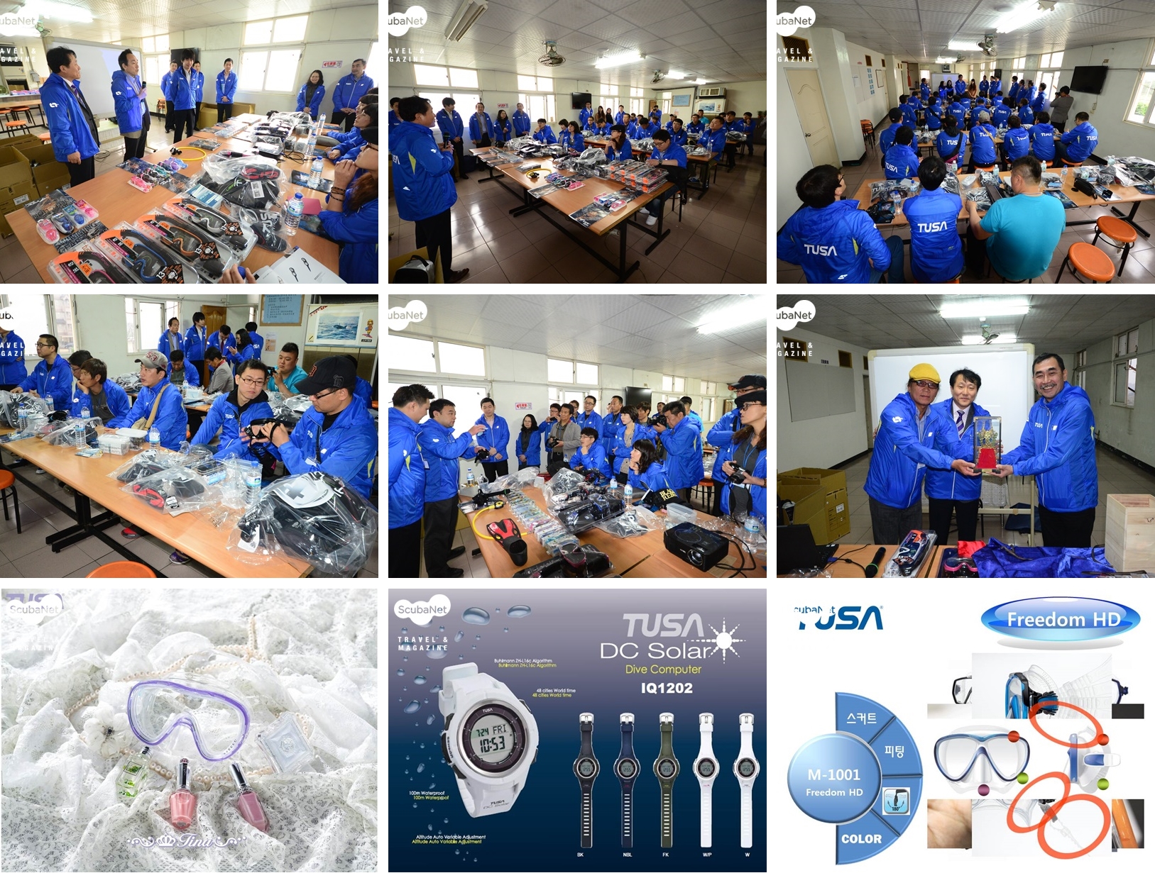이번 딜러투어에서는 이렇게 타바타와 TUSA에 대한 소개와 함께 2014년 신제품 설명도 있었다. 폭넓은 시야를 제공하는 프리덤 마스크와 여성들의 기호에 맞는 티나, 다이빙 중에 마스크에 김이 서리는 것을 막아주는 안티포그 필름, 태양광 충전 기능이 있는 IQ1202 다이브컴퓨터 등이 소개되었다.