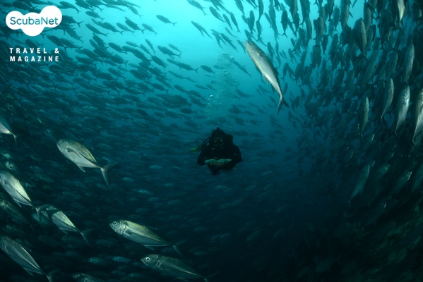 워싱머신(Washing Machine)은 조류가 강하여 그런 포인트 이름을 갖게 되었지만 때를 잘 맞추지 못하면 평범한 다이빙 포인트가 될 수 밖에 없다. 조류가 없는 워싱 머신을 킥을 하여 이동하려니 힘이 들어 느긋하게 월을 따라 움직여 보았다. 오버행 사이의 화려한 산호들과 외해로 지나가는 덩치 큰 독투스 투나(Dogtooth Tuna), 자이언트 트레발리(Giant Trevally) 등의 대물들이 어슬렁 거리는 것을 볼 수 있었다
