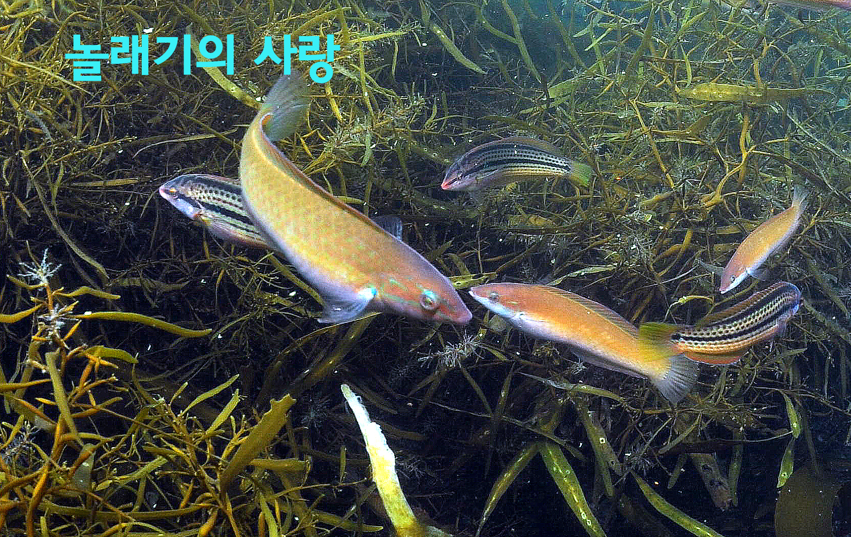 열두 번째 사랑구경의 대상은 놀래기(Halichoeres tenuispinis)입니다. 놀래기는 우리나라 남해와 제주도 연안에서 쉽게 볼 수 있습니다. 저조선 아래에서 20 m 수심 사이에 모자반류의 해조가 밀생한 암초지대에 살고 있습니다. 몸 크기는 15cm 정도이며, 용치놀래기와 비슷하지만 몸의 무늬가 없습니다. 그러나 체색은 크게 2가지로 나눠집니다. 흰 복부를 제외하고 전체가 황갈색인 것과 검은 색과 붉은 색을 기조로 녹색의 점무늬가 있는 것입니다. 전자는 암컷과 1차수컷이고, 후자는 암컷에서 성전환한 2차수컷입니다. 놀래기는 농어목, 놀래기과에 속하는 물고기로 북서태평양의 우리나라 남해안, 남일본, 대만, 홍콩, 중국 등에 분포하고 있습니다. 낮에 주로 활동하며 밤에는 모래 속으로 파고들어가 잠을 잡니다. 수온이 13℃ 이하로 떨어지면 모래 속으로 들어가 동면을 합니다.
