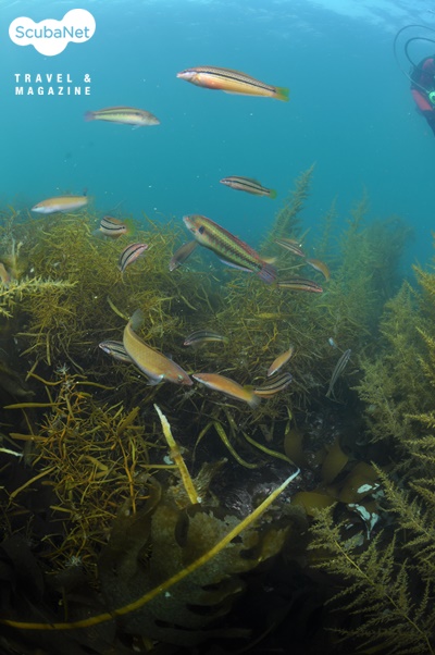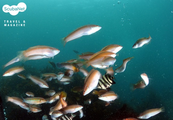 해초 숲 위에서 놀고 있는 놀래기들, 용치 놀래기도 섞여 있다