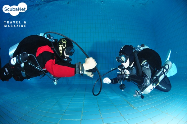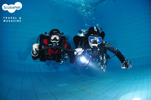 실습: 드라이 런과 수영장 교육이론 교육 중에 틈틈히 동굴과 난파선 탐사 동영상을 보면서 다이브 걸들은 멋진 수중 환경과 새로운 목적지를 찾아나서는 탐사의 매력에 흠뻑 빠진 채 실습이 시작됐다. 물속에 들어가기 전에 먼저 드라이 런 교육이 있었다. 수중에서 연습할 자세와 스킬들을 지상에서 먼저 연습을 하여 익히고 충분히 피드백을 하기 위함이었다. 책상에 엎드려 핀을 신고 트림 자세와 킥 연습을 하고 비씨와 호흡기, 라이트를 착용하고 베이직 6 연습을 했다. 롱호스 세팅에 라이트까지 착용을 하니 어색하기도 하고 호스가 어디로 지나가야 하는지 헷갈리기도 했지만 반복에 반복을 거듭해 조금씩 몸에 익혀나갔다. 박헌영 트레이너는 빨리 동작을 하는 것보다 제대로 하면서 몸의 근육들이 기억하게 하는 것이 중요하다고 강조했다.