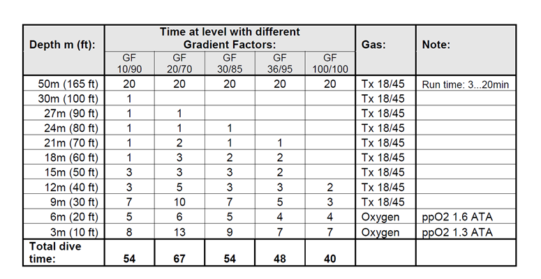 다이버가 50m에서 20분간 바텀 타임을 가지면서 트라이믹스 18/45(18% 산소, 45% 헬륨)를 메인 기체로 사용하고, 산소를 6m부터 감압을 위해 사용한다. 하강 속도는 15m/min이고, 상승 속도는 10m/min이다. 감압 알고리즘은 불만 ZH-L16B와 다른 감압 테이블들, 그리고 테이블 1에 나오는 5가지 다른 GF에 따랐다.