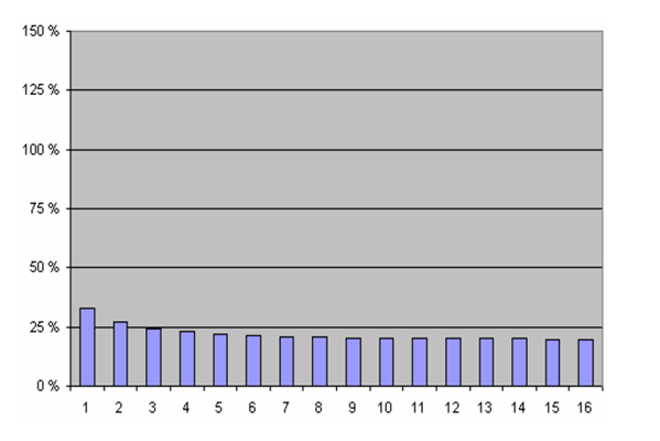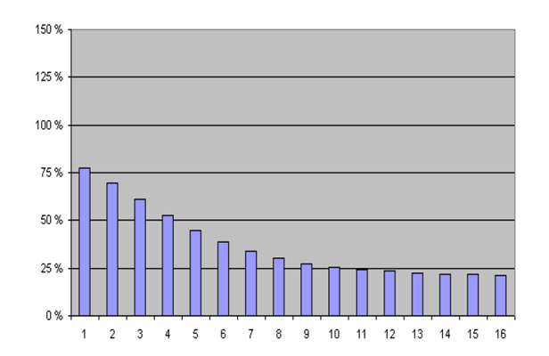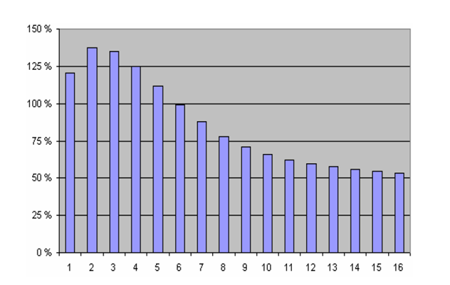 그림 2는 그림 1에서 보여준 다이빙에서 이들 16개 조직 구획을 묘사하고 있다. 조직 구획이 100% 가득 차면 포화점에 도달하게 된다. 상승 단계에서 조직 구획은 과포화(100% 초과)가 된다. 감압의 핵심은 우리의 조직과 혈액에 과도한 기포가 형성되지 않는 수준에서 과포화를 유지하는 것이다.