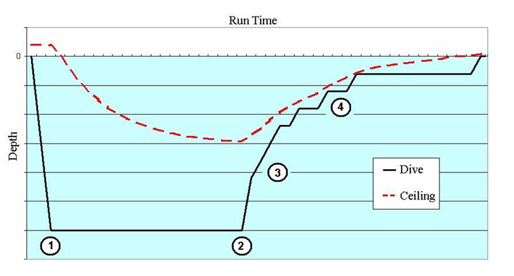 그림 1은 여러 번의 감압정지가 있는 전형적인 감압다이빙 프로파일을 보여준다. 다이빙 전에는 다이버의 천정이 실제 마이너스 수심(즉 수면 위)에 있으며, 이 말은 다이버의 조직이 특정한 과압 기울기를 견딜 수 있다는 의미이다. 다이빙이 진행되고 다이버가 바닥에서 머무는 시간이 증가하게 되면 천정 수심도 따라서 하강하게 되어 상승 기회를 제한하기 시작하며, 감압의 필요성을 만들게 된다. 사실 일부 감압 소프트웨어는 다이버가 원하는 다이빙 수심을 입력하면 천정 수심을 표시해준다. 다이버 컴퓨터들은 가장 깊은 감압 요구 수심으로 천정을 표시한다.