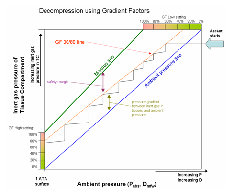 Gradient Factors(압력경사도 인자)압력경사는 불만의 감압 모델을 위한 보수성 설정을 제공하기 위한 것이다. 앞에서 언급했듯이, M-값 직선은 상승 및 감압하는 동안 초과해서는 안 되는 한계를 설정하고 있다. 그러나 다이빙이나 다이버들은 모두 제 각각이기 때문에 모든 DCS 사례를 긍정적으로 예방할 수 있는 감압 모델은 없으므로, 추가의 안전 여분을 적용해야만 한다.