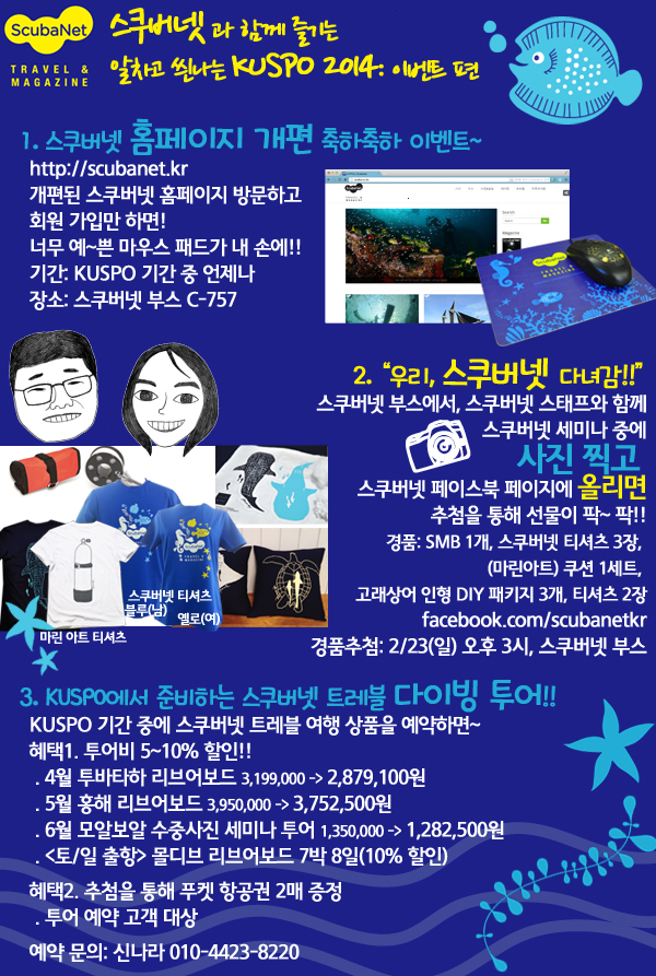 (주)스쿠버넷 트레블&매거진에서는 2014년 2월 20일부터 23일까지 COEX Hall C에서 열리는 수중스포츠전시회 KUSPO에 참가하여 다양한 이벤트와 세미나를 진행합니다.