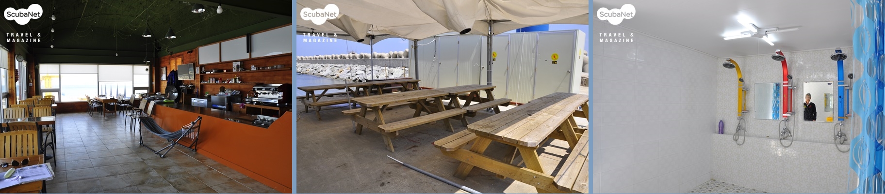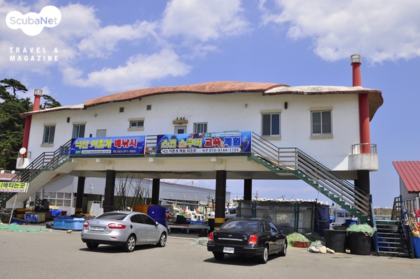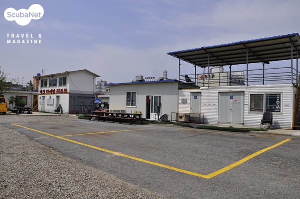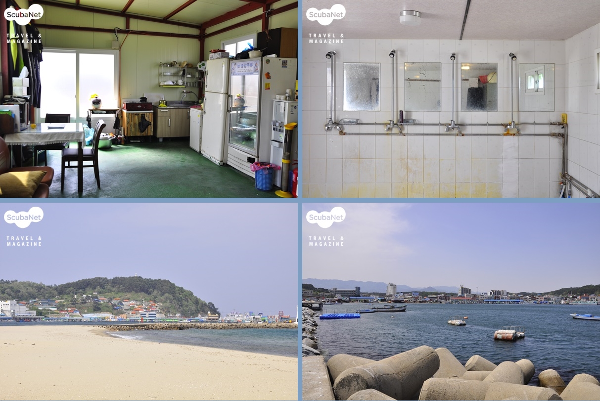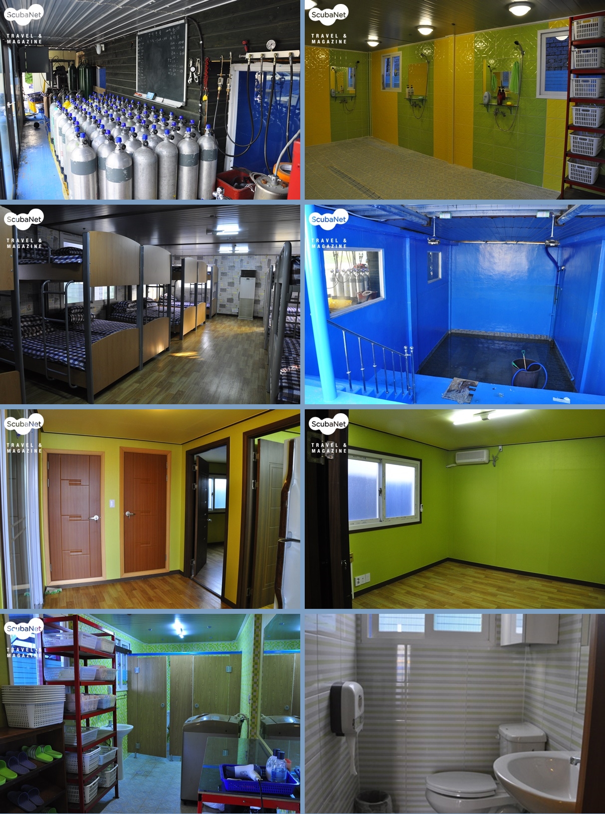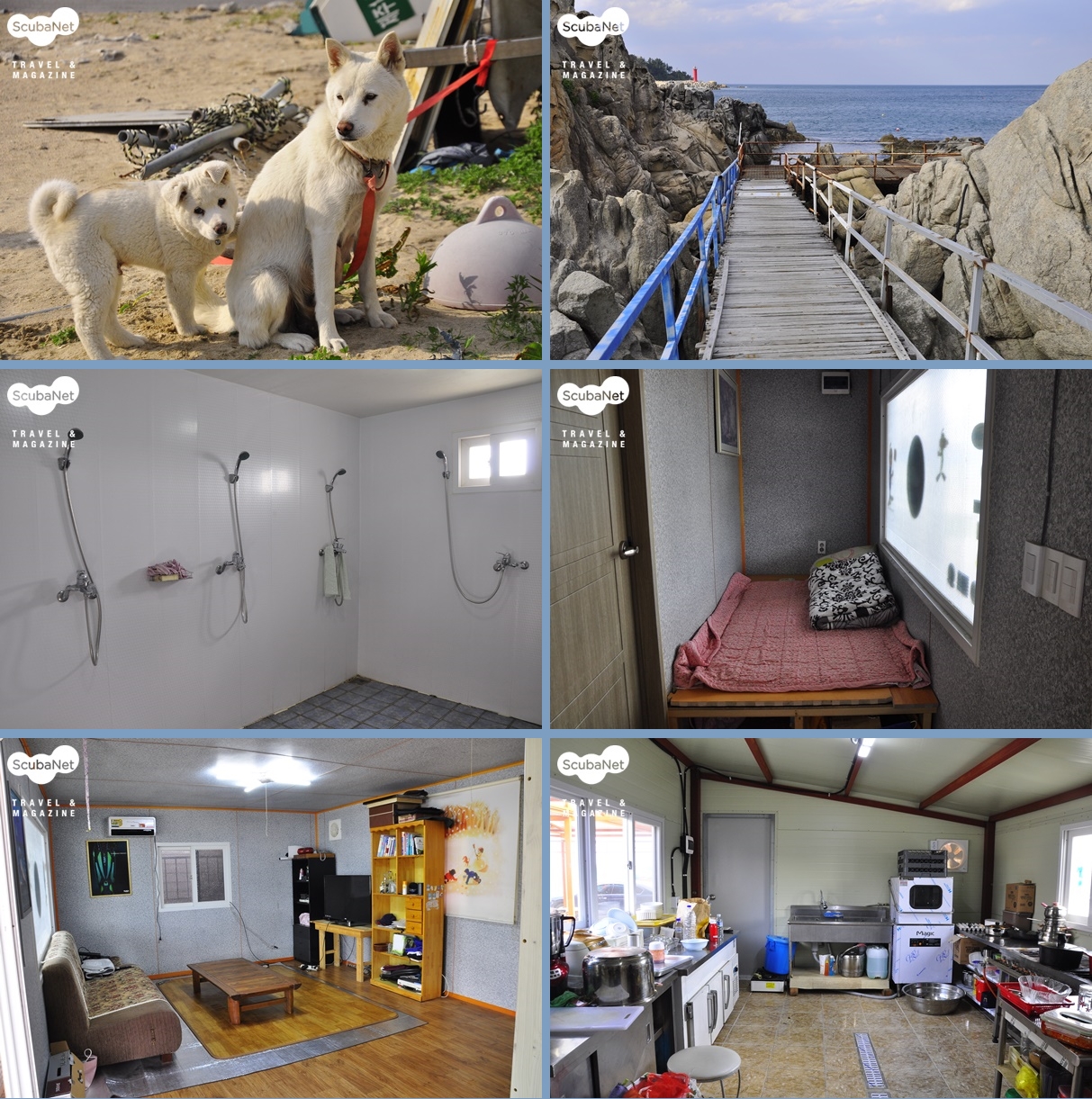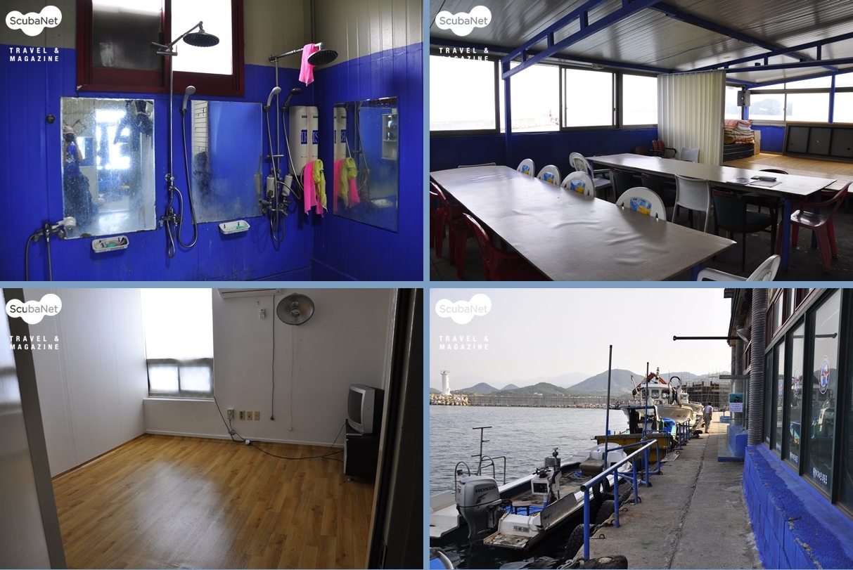 2층 건물로 된 리조트에는 1층에 장비실과 충전실, 수심 3m(가로 11m, 세로 5.5m)의 제법 큰 수영장이 있고 식당과 카페가 들어올 예정이다. 2층에는 사무실과 숙소가 준비되었고 세미나실이 증축 중에 있다. 숙소는 게스트 하우스 형식으로 2층 침대가 놓인 큰 방과 작은 온돌방 2개가 있다. 리조트에서 길을 건너면 바로 백사장이고 그 백사장에 배를 대기 위한 계류장을 만들었다. 다이버들은 자신의 장비만 챙겨 계류장으로 이동해 그곳에 있는 탱크를 사용하면 된다. 계류장에는 탱크와 장비를 세워놓을 수 있는 공간이 있고 편안히 앉아서 장비를 착용하고 쉴 수 있는 자리가 마련되어 있다. 계류장에서 배로 승선할 수도 있고 비치 다이빙을 시작할 수도 있다. 교육생들의 입수 연습으로도 좋다. 자이언트 스트라이드로 입수하고 계단으로 걸어 올라오면 된다. 가장 불편함을 느끼는 사람들이 가장 편하게 다이빙을 배우고 즐길 수 있는 곳을 만들기 위해 노력했다는 김경혁 대표의 말이 계류장에서 여실히 드러난다.
