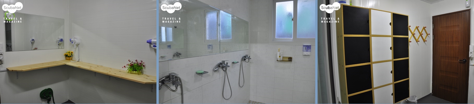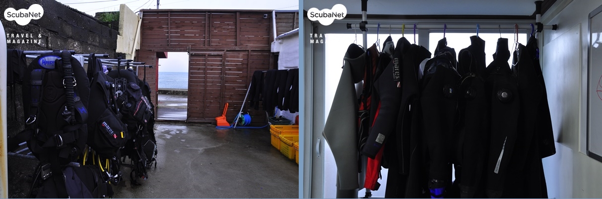 탈의실과 샤워실성산 스쿠버 리조트에서는 드라이슈트 렌탈이 가능하다. 드라이슈트는 고가이기도 하고 목씰과 손목씰 잘 맞지 않아 렌탈을 하기 어려운데 성산에서는 발상의 전환을 했다. 목씰과 손목씰을 구입하면 무료로 드라이슈트를 렌탈해주는 것이다. 물론 드라이슈트 다이빙을 해보지 않은 사람에게는 별도의 교육을 진행한다. 드라이슈트 렌탈이 판매로 이어지는 경우도 많다고 한다.