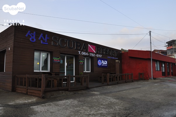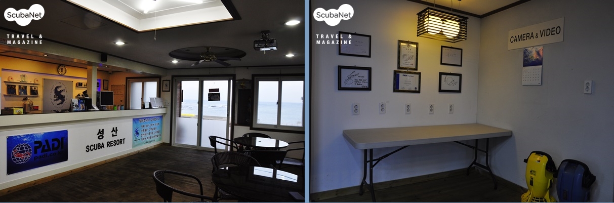 성산 일출봉 아래 위치한 성산 스쿠버 리조트는 2012년 4월 PADI 김영언 강사가 인수하여 약 1년 간 리모델링을 거쳐 현재의 모습을 갖추게 됐다. 지난해에 리모델링을 한 만큼 리조트 곳곳이 깔끔하게 단장된 모습이었다. 나무로 마감을 한 건물 외벽은 따스하고 편안한 느낌이고 밝고 깨끗한 내부는 카페를 연상시킨다.