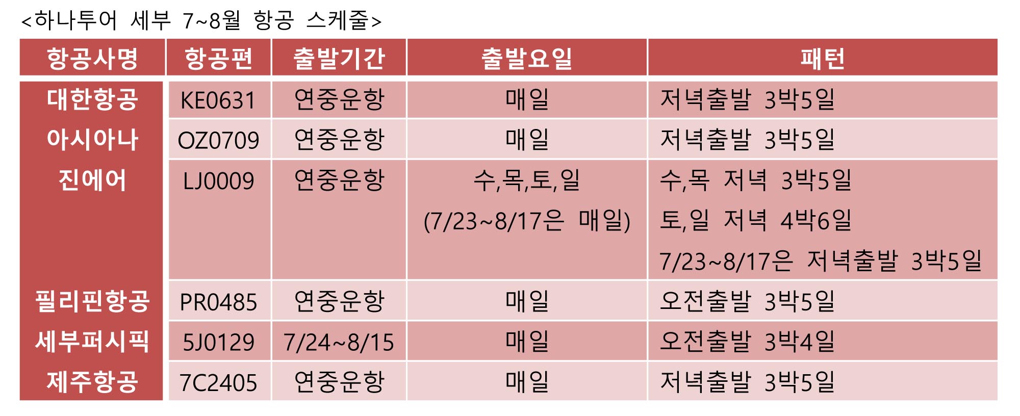 ‘성수기 시즌 항공권 뽀개기’ 여행의 성수기 시즌인 7월이다. 7~8월은 학생들의 방학과 직장인들의 휴가가 겹치는 시기이기 때문에 투어를 떠나는 사람의 수도 급증하게 된다. 그렇기 때문에 이러한 성수기 시즌에는 아무리 비싼 항공 요금에도 불구하고 좌석이 여유롭지 않고 많이 막히게 된다. 이에 대처해서 하나투어에서는 세부 전세기를 준비하고 있다. 성수기 시즌에 여행사 중 항공 좌석을 최대로 확보하고 있으며, 다양한 항공 스케줄로도 이용 할 수 있기에 휴가철이 되면 항공 관련 문의가 쏟아진다. 항공 요금은 보통 항공사에서 지정된 패턴으로 이용하는 것이 저렴한데 아래의 표는 각 항공사의 스케줄과 패턴을 정리한 것이다.