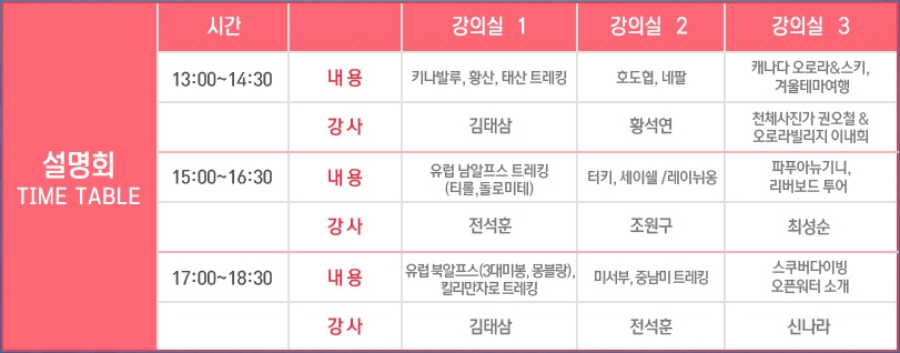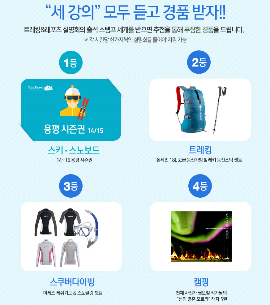 방문 신청 후 설명회를 듣는 신청자에게는 CGV 영화관람권과 커피음료쿠폰이 선착순 200명에게 증정된다. 사전 신청하지 못한 설명회 현장 방문자들을 위한 푸짐한 선물도 준비되어 있는데, 3가지 이상의 강의를 들으면 추첨을 통해 경품이 지급된다. 1등 상품으로는 용평 14/15 스키 시즌권, 2등- 몬테인 18L 고급 등산가방&레키 등산 스틱 세트, 3등- 마레스 레쉬가드&스노클링, 4등- 천체 사진가 권오철 작가의 “신의 영혼 오로라” 책이 준비되어 있다.