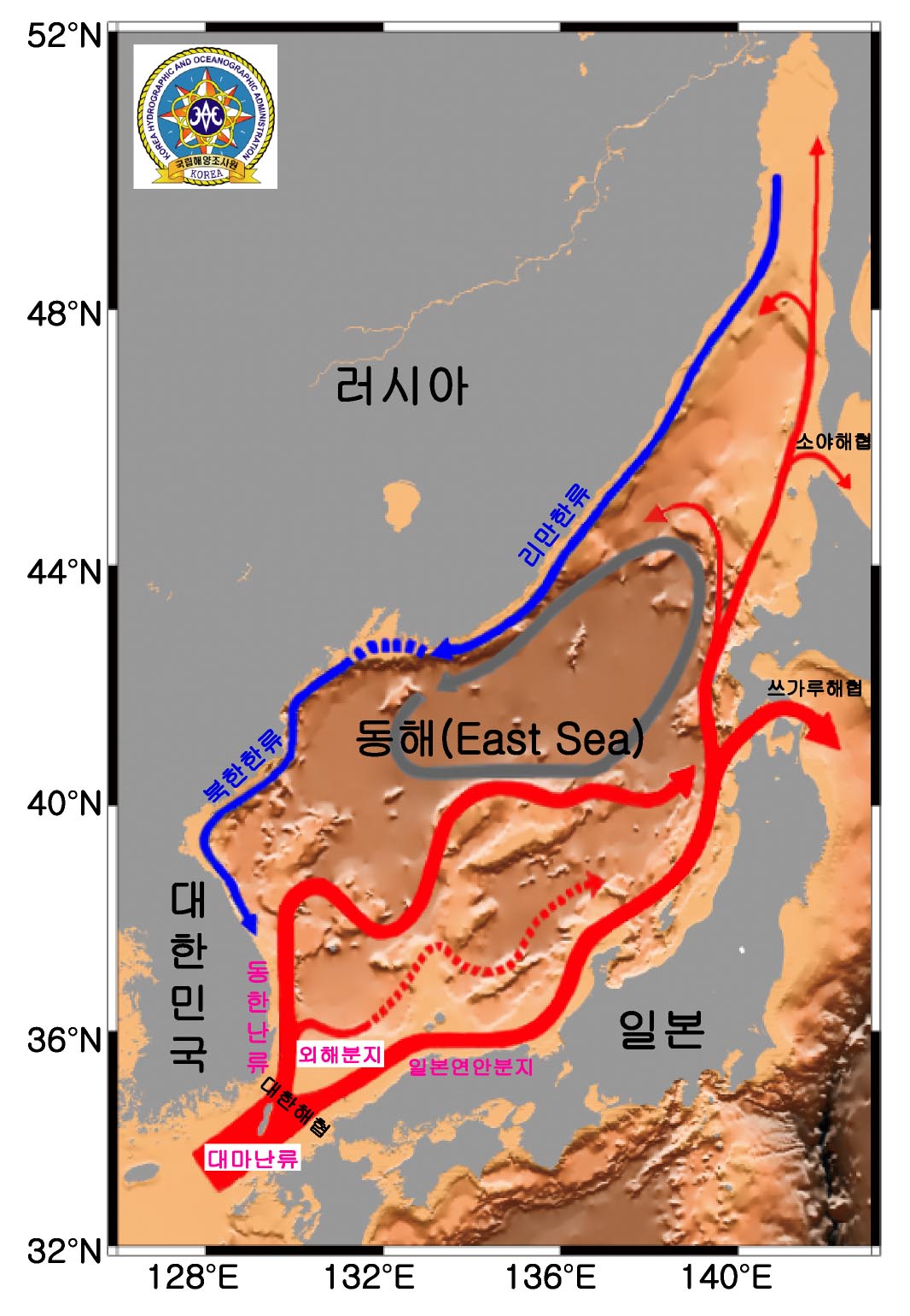동해에 영향을 미치는 해류동해에서 다이빙을 하고자 한다면 해류에 대해서도 좀 알아야 한다. 해류는 수온과 투명도 등 비슷한 성질을 가진 물덩어리(수괴)가 움직이는 것이다 동해(East Sea)는 한국, 일본, 러시아로 둘러싸여 있는 반 폐쇄성 해역으로 동중국해에서 남해로 올라온 고온고염에 투명한 대마난류(쿠로시오 해류의 지류)가 대한해협을 통해 동해로 유입된다. 대마난류가 갈라져서 우리나라 동해안을 따라 북쪽으로 흐르는 흐름을 동한난류(East Korea Warm Current)라고 하는데 북위 37°~38° 부근까지 투명하고 따뜻한 바닷물을 공급한다. 이 동한난류는 봄, 여름에 비해서 가을철에 위력이 강하여 가장 북쪽으로 흐른다. 가을철 동해안에 수온이 따뜻하고, 시야가 20m 가까이 좋아지는 것은 이 때문이다.
