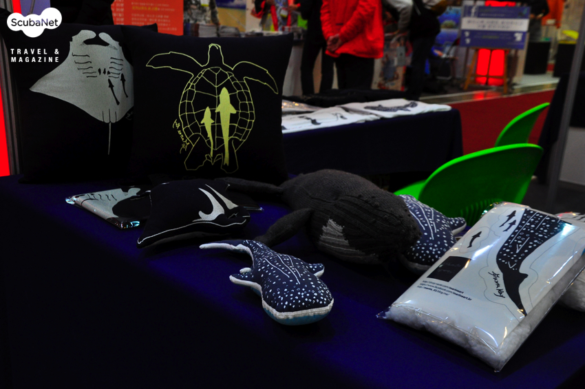 이런 귀여운 고래상어, 만타 인형과 보기에도 편안하고 세련된 쿠션은 마린아트에서 전시, 판매하고 있고요 앞뒤가 다 멋진 티셔츠도 있어요. 역시 스쿠버넷 부스에서 만나실 수 있습니다! (일요일에는 고래상어 인형 만드는 세미나도 열려요~)