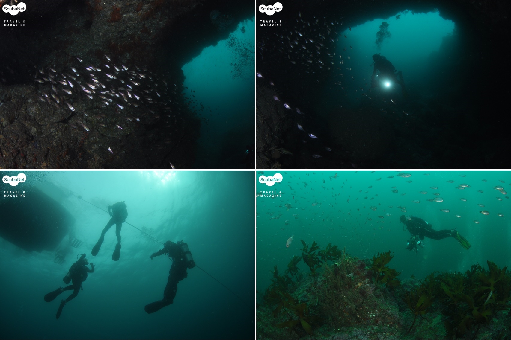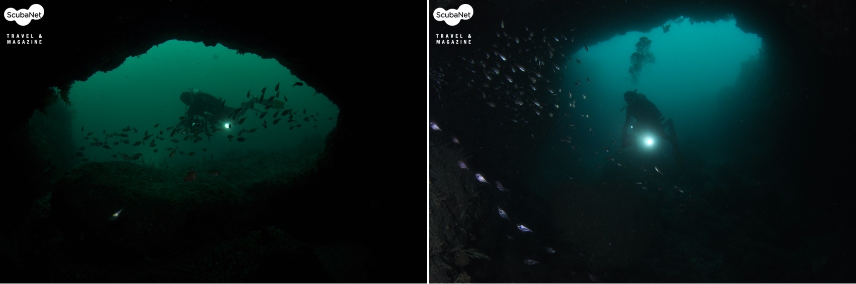 쌍굴 포인트아치 포인트에서 동쪽으로 약 100m 거리에 있다. 쌍굴 다이빙은 화순항에서 주로 수중사진 작업을 하는 이운철 강사와 함께했다. 하강라인을 따라 내려가 동굴로 들어가기 전 먼저 높게 솟은 주상절리를 향했다.