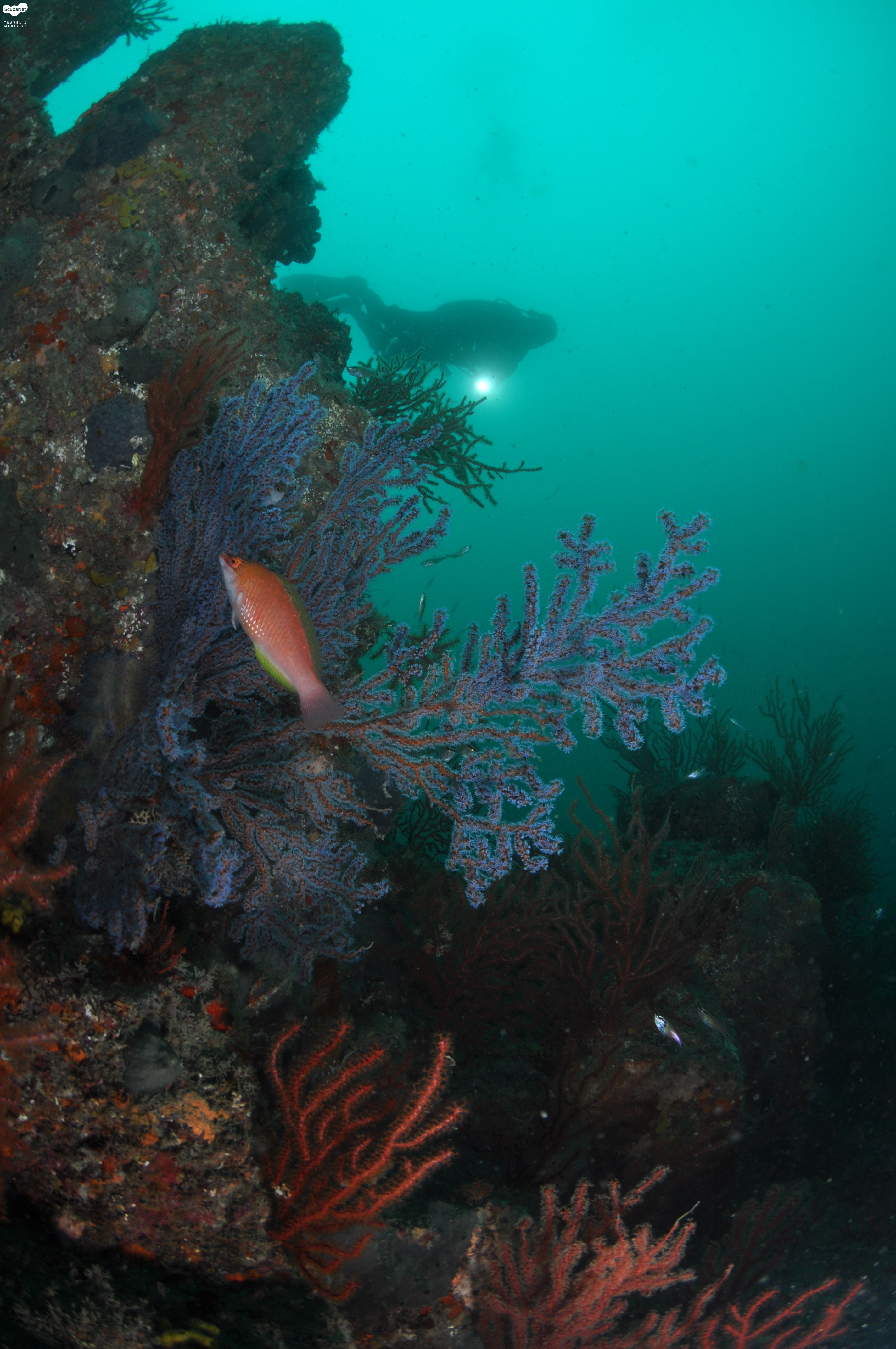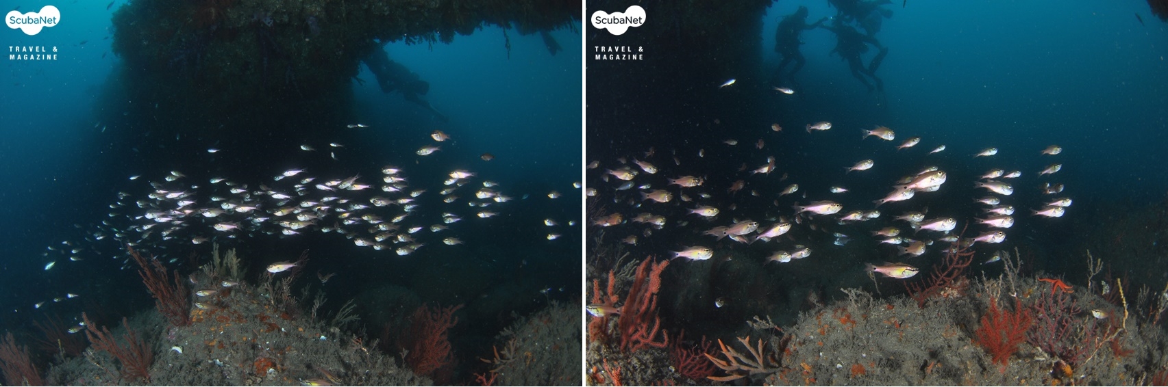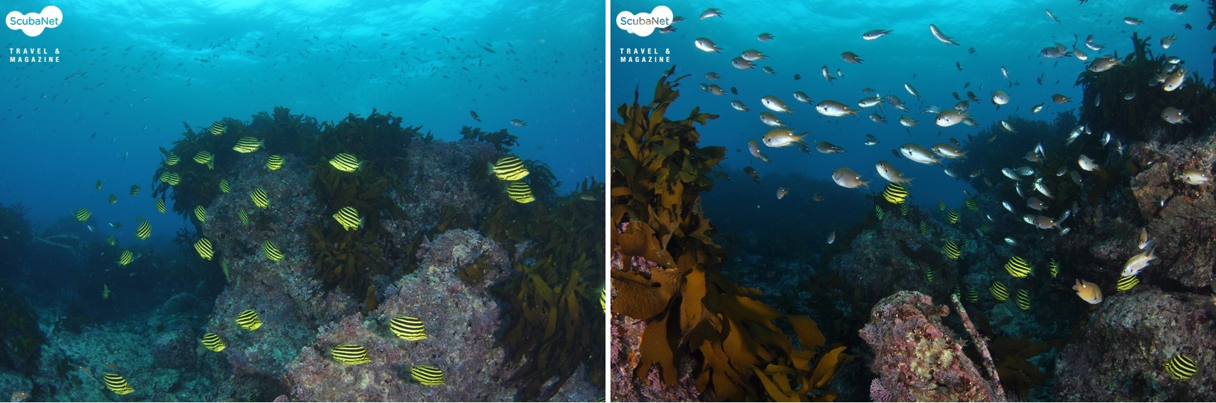 가까이 다가가도 무리는 크게 흐트러지지 않는다. 주상절리 절벽을 따라 이동하면 분홍바다맨드라미가 군락을 이루고 커다란 해송도 눈에 띈다. 절벽 주위로는 수백 마리의 자리돔 떼가 군무를 펼치고 범돔 무리도 만날 수 있다. 절벽을 따라 크게 한 바퀴를 돌고 다시 아치로 돌아와 다이빙을 마친다. 커다란 아치가 만드는 흥미로운 지형과 그 안에 자리잡은 연산호, 각종 물고기들의 생태가 아름다운 조화를 이루며 독특한 볼거리를 만드는 포인트다.